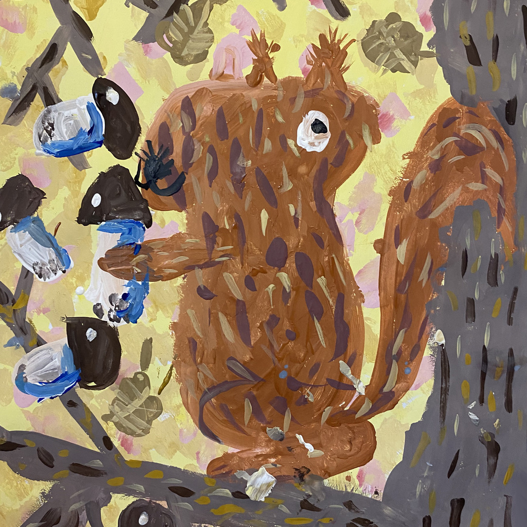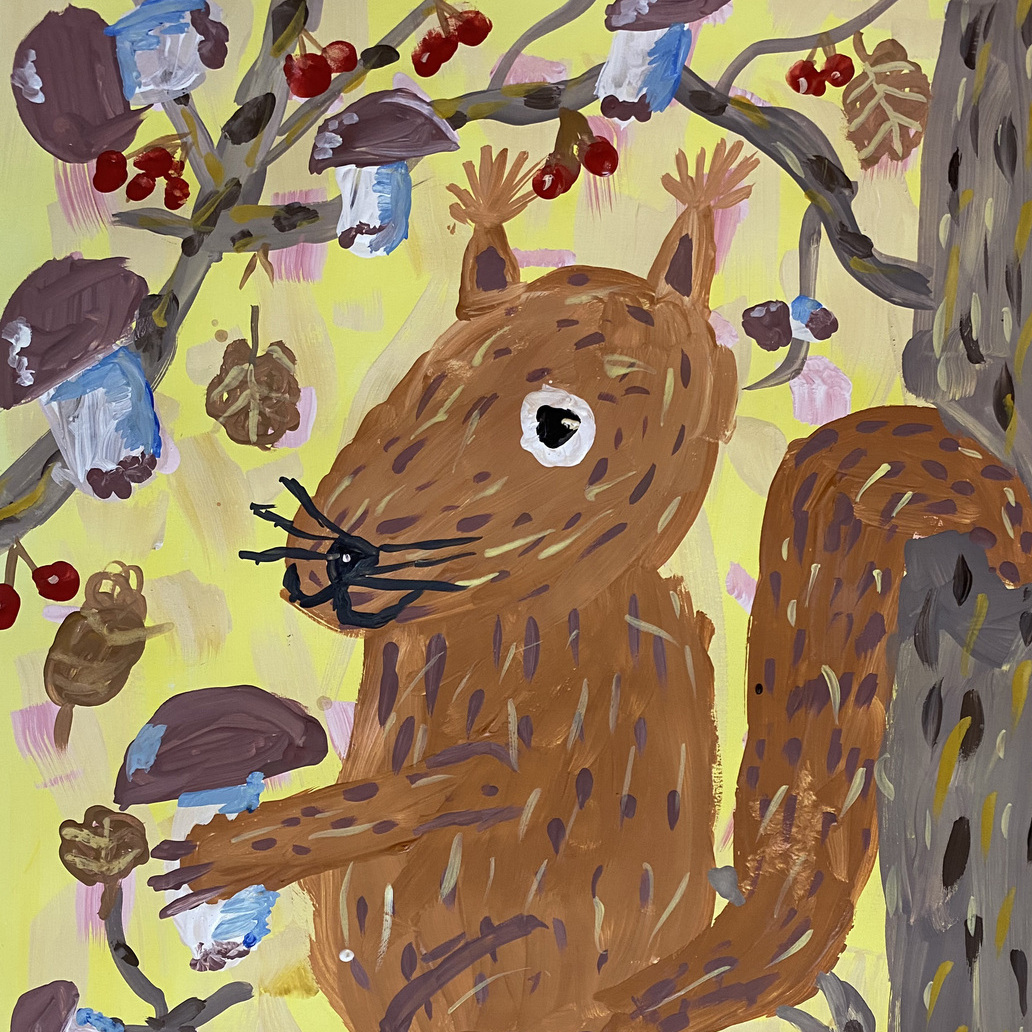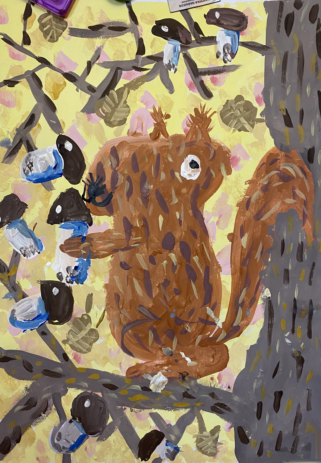 Этот учебный год мы начали с осенней палитры и рисовали гуашью белку в утреннем лесу.